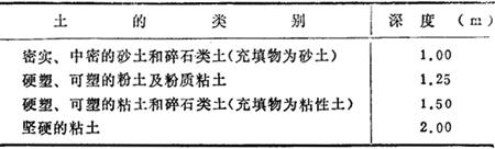 注:①静载指堆土或材料等,动载指机械挖土或汽车运输作业等。静载或动载距挖方边缘的距离应保证边坡和直立壁的稳定,堆土或材料应距挖方边缘0.8m以外,高度不超过1.5m。 ②当有成熟施工经验时,可不受本表限制。 (4)当土质均匀且地下水位低于基坑(槽)或管沟的底面标高时,其挖方边坡作成垂直立壁不加支撑的深度,不宜超过表17-100的规定。 表17-100 基抗(槽)作成垂直立壁而不加支撑的深度规定