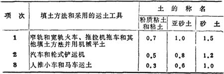 注:人工打夯时,土块粒径不应大于5cm。 5)利用运土工具压实填方时,每层铺土的最大厚度(表17-105)。 表17-105 利用运土工具压实填方时的每层填土的最大厚度(m)