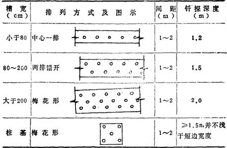 注:对于较软弱的新近沉积粘性土和人工杂填土的地基,钎孔间矩应不大于1.5m。 表17-107 探孔布置