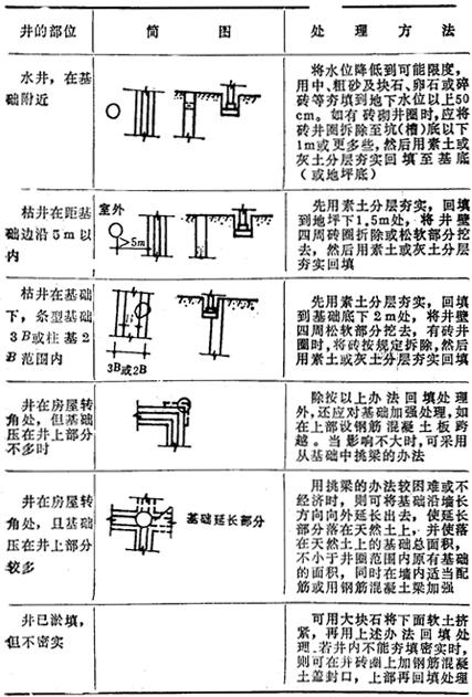 注;1-挖除松软土,回填好土;2-2∶8灰土。 (2)砖井或土井的处理见表17-109。 表17-109 砖井或土井的处理
