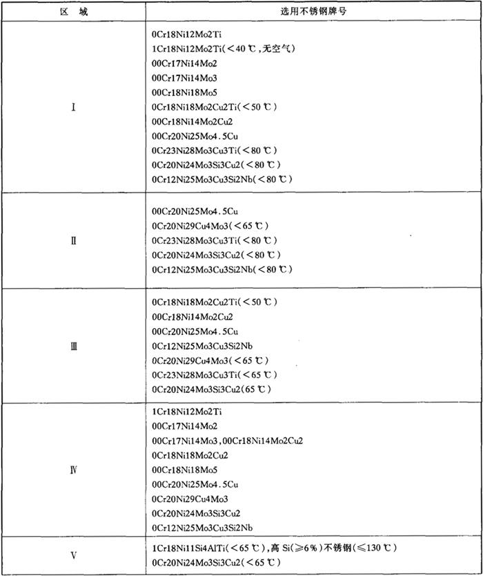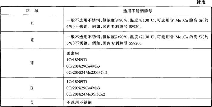 | 释义 | 在硫酸介质中不锈钢的选择 硫酸对不锈钢的腐蚀,与酸的浓度和温度有关。通常,在纯硫酸中不选择不含Mo的Cr-Ni奥氏体不锈钢作为结构材料。根据硫酸的腐蚀性和不锈钢的耐蚀性,可按图3-4划分的区域进行合理选用。通常,0Cr17Ni12Mo2是在硫酸介质中可应用的最低牌号,一些Mo、Cu复合的高性能不锈钢仅能用于80℃以下的各种浓度的硫酸中,在高于80℃,90%以下的硫酸中,只能选用镍基或铁镍基耐蚀合金。在高温高浓硫酸(90%~98%)中,高Si(约6%)并含Mo、Cu的不锈钢具有优良的耐蚀性。在图3-4中各区域可选用的不锈钢牌号见表3-4。 表3-4 在不同浓度的硫酸中不锈钢的选择