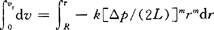 经过数学处理,得: Vr=k[△p/(2L)]m[Rm+1/(m+1)][1-(r/R)m+1] (1-34) 当r=0时,v0[即vmax]为: v0=k[△P/2(L)]m[Rm+1/(m+2)] (1-35) 所以,式(1-34)可写成如下的形式: vr=v0[1-(r/R)m+1] (1-36) 因为,微流量dQ=vr·2πrdr 故有: