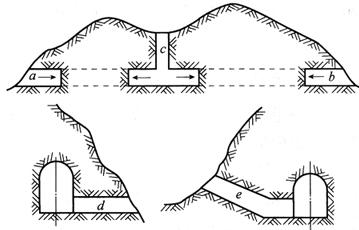 图12-6 地下工程贯通方式 a,b,d-平洞;c-竖井;e-斜井 3.地下施工测量的精度 地下施工测量的精度主要指相向开挖的隧道,在贯通面上中线的横向允许偏差和垂线方向上的高程允许偏差。测量工作应根据不同地下工程的允许偏差要求,确定地面控制网的等级,选择适当的测量仪器和合理的观测方法。 |
