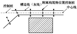 在施工时,中线上的各桩将被挖掉,应在不受施工干扰、便于引测和保存点位处测设施工控制桩,用以恢复中线;测设地物位置控制桩,用以恢复管道附属构筑物的位置,如图14-19所示。中线控制桩的位置,一般是测设在管道起止点及各转点处中心线的延长线上,附属构筑物控制桩则测设在管道中线的垂直线上。