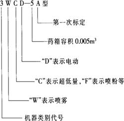 | 释义 | 型号编制方法 植保机械的型号,由首部、中部和尾部3部分组成,例如,3WBS-16表示手动背负式、药箱容积为0.016m3的喷雾器,“3”为首部,表示农业机械类别代号;字母部分为中部,其中“W”表示“喷雾”,“B”表示“背负”,“S”代表“手动”;“16”为尾部,表示药箱容积为0.016m3。有时尾部数字部分带有字母“A”、“B”、“C”等,A表示第一次标定。 再如,