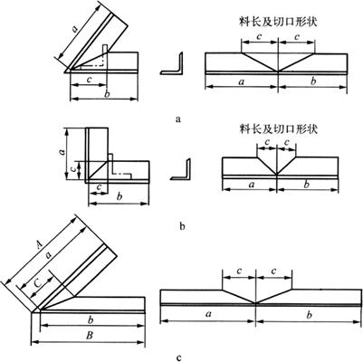 | 释义 | 型钢切口计算号料 型钢弯曲切口下料在现场下料工作中占有很大比重,特别是角钢与槽钢,下料时须依据图样要求画出实样图,用样板进行号料或用直尺直接在工件上进行号料。型钢切口号料,一般比较简单,可通过图例直接领会作图方法,不必叙述作图步骤。因此,这里仅以角钢和槽钢为例,通过图示说明料长及切口形状。 (一)角钢弯曲切口形状及料长 1.角钢内弯任意角外尖角 图5-32a所示为角钢切口内弯成锐角时的切口和料长,左边图为工件成型后的形状和尺寸,右边为切口形状和料长。角钢切口内弯钝角等所用方法与内弯锐角相同,如图5-32b、c所示角钢切口内弯直角、任意角的切口和料长。