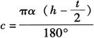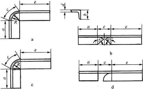 图5-33 角钢内弯90°外圆角料长及切口形状 a.切口位于45°分角线上 b.45°分角线上的切口形状及料长 c.切口位于直角边线上 d.直角边线上的切口形状及料长 图5-33中弯曲面中心弧长按下式计算:
