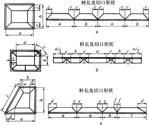 式中c——弯曲面中心层弧长(mm); R——内圆弧半径(mm); d——角钢的厚度(mm)。 3.角钢内弯各种框形 如图5-34所示,图5-34a为角钢内弯矩形框时的切口形状及料长,图5-34b为角钢内弯外圆角矩形框时的切口形状及料长,而图5-34c则为角钢内弯梯形框时的切口形状及料长。图5-34中尺寸计算公式为