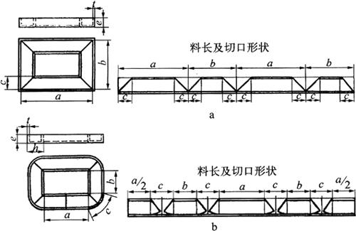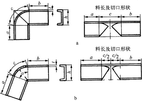 图5-36 槽钢侧弯矩形框料长及切口形状 a.侧弯直角矩形框 b.侧弯圆角矩形框 (2)槽钢侧弯圆角矩形框:图5-36b所示为槽钢切口侧弯圆角矩形框的料长及切口形状;右图为槽钢平弯90°圆角时的料长及切口形状。 图中尺寸的计算公式为