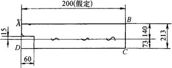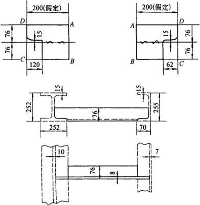 图3-163 H钢(与槽钢相连)垂直拉撑切头样板 作切头样板的方法是:根据H钢规格的大小决定假设端头样板的长度,太长了会造成浪费,太短了导向范围小,本例取长度为200mm,其步骤是: ①作ABCD矩形框,使其长宽为200×213(mm),为基础实形。 ②在基础实形中作出间隔140mm(腹板内腔高)和73mm(翼板内腔宽)的平行线。 ③在端头再划出15mm和60mm缺口线。 ④作两个正反曲样板各划一端头,即得端头切割线(作一个样板正反使用亦可)。 4.槽钢与槽钢、H钢垂直拉撑料计算 如图3-164所示,左侧为槽钢与槽钢垂直相连,右侧为槽钢与H钢垂直相连施工图,图3-165为端头样板展开图。