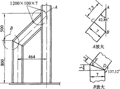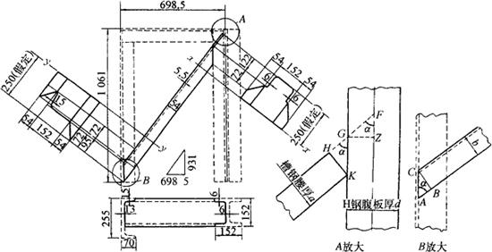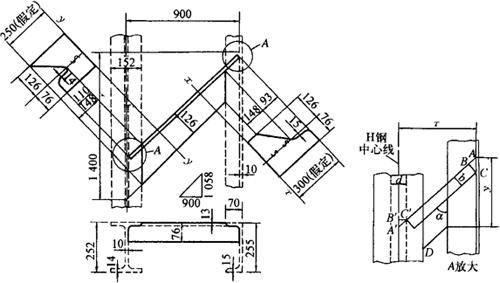 图3-160 不等边角钢与H钢、槽钢斜拉撑施工图及展开图 (1)斜拉撑顶角