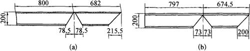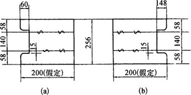 图3-165 槽钢与槽钢、H钢垂直拉撑切实样板 (a)与槽钢切头样板;(b)与H钢切头样板 用槽钢断面之58mm、140mm和58mm共256mm作为宽,用假定的200mm作为长,划出基础实形并引出平行线,在平行线上分别去掉含着部分长60mm和翼板厚15mm,即得切头样板。 ③槽钢与H钢的切头样板[见图3-165(b)]。 同上法作出基础实形,在平行线上分别去掉含着部分长148mm和翼板厚15mm,即得切头样板。 5.槽钢与槽钢、H钢斜拉撑料计算 如图3-166所示,左侧为槽钢与槽钢斜接,右侧为槽钢与H钢斜接,现将计算方法和作样板方法叙述如下。