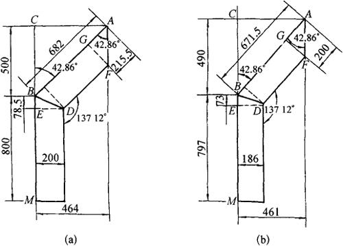图3-159 等边角钢与H钢、槽钢垂直拉撑施工图及展开图 ①作基础实形ABCD,使长×宽=200×152(mm2)。 ②在实形中作出76mm的中心线。 ③在端头划出15mm、120mm(H钢)和62mm(槽钢)的缺口线。 2.不等边角钢与H钢、槽钢斜拉撑料计算 如图3-160所示,左侧为不等边角钢与H钢倾斜连接,右侧与槽钢倾斜连接。下面分别叙述料计算和端头样板的作法。