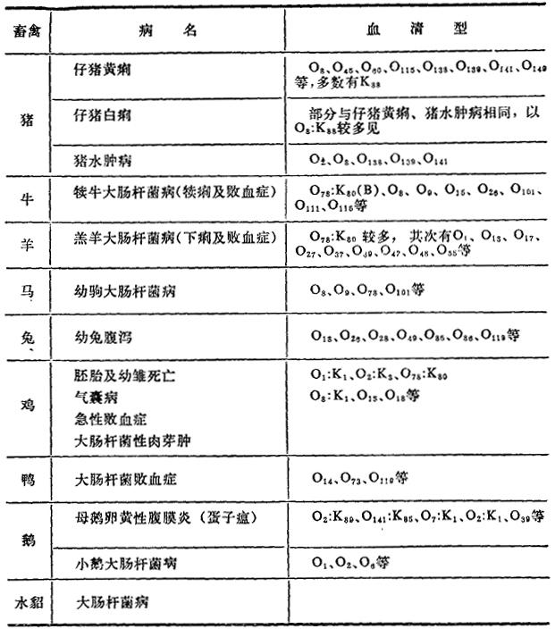 | 释义 | 埃希氏菌属 埃希氏菌属除具有肠杆菌科的特性外,其主要生化特点吲哚阳性、M.R.阳性、V.P.阴性、不利用柠檬酸盐、不产生H2S、不分解尿素(有的不脱羧埃希氏菌可能分解尿素,但兽医微生物检验工作中罕见)、发酵乳糖(少数迟缓发酵)及另外一些碳水化物产酸又产气(CO2及H2)。此属中致病菌及卫生检验中最常遇见的是大肠埃希氏菌(E.coli),系人类和其他动物肠道后段的常住菌,故常将此菌的有无或多少作为饮水、食品、用具等卫生评价的依据。已往多认为它是条件性致病菌,现确认其中部分是真正的致病菌。 形态染色特性:革兰氏阴性,卵圆形或杆状,大小为1~3×0.4~0.7μm,单独或成双存在,无芽孢,无荚膜,大多数能运动,具周身鞭毛。多数菌株在适宜培养条件下可以出现菌毛,是取得营养、传递质粒的通道,也是噬菌体接触的地方,还能使某些动物的红细胞发生凝集。这种凝集性能有的因甘露糖存在而不出现,称为甘露糖(Manose)敏感(Sensitive)株,简称为MS株;另一些称为甘露糖抵抗(Resistent)株,简称为MR株,即有甘露糖时仍照样凝集。 生长要求及培养特性:见检验项下。 生化特性:见表11-1及表11-3。 抗原结构与血清型:本菌有O、K、H抗原,据此分成不同的血清型,O抗原有170种、K抗原99种和H抗原52种。根据对大肠杆菌(即大肠埃希氏菌)的鉴定,可写出某型大肠杆菌的抗原式。如O111∶K58(B)∶H12,表型该菌具O抗原111、K抗原58属于B类、H抗原为12。 血清型与病原性:不同血清型的大肠杆菌可使不同的动物致病,但有的血清型能使多种动物发病,见表11-4。 表11-4 大肠杆菌血清型与畜禽疾病