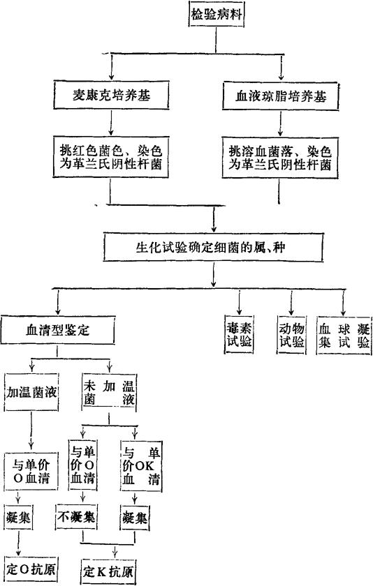 检验方法及步骤如下。 样品采集:可采取病畜禽的小肠及内容物;败血病例可取血液或肝脾肺肾等;见腹膜炎、肉芽肿、气囊炎时,采取局部病变组织;死胚取其尿囊液、卵黄;腹泻病例可以灭菌棉拭从直肠采取粪便。 细菌培养:采样作划线,接种于普通琼脂平皿、麦康克培养基、血琼脂平皿,于37℃培养24h。大肠杆菌在普通的营养琼脂上形成直径约2mm、圆形、隆起、光滑、湿润、半透明带淡灰色的菌落,在麦康克琼脂上的菌落为红色,部分致病性大肠杆菌在血平皿上出现3型溶血。挑取上述菌落,涂片、染色、镜检,如为革兰氏阴性中等大小杆菌,作成纯培养,移植到三糖铁琼脂上,并继续作生化反应,如具下述特性,即可作大肠埃希氏菌的诊断报告,即:乳糖、葡萄糖均产酸产气,ONPG阳性,产生吲哚,M.R.阳性,V.P.阴性,不利用柠檬酸盐,不产生H2S,不分解尿素,运动,KCN中不生长。 血清型鉴定:对已诊断为大肠杆菌,如有需要,可将18h的固体培养物洗下分成两份。一份经121℃处理2h成加温菌液,另一份加福尔马林(通常为40%甲醛)使福尔马林含量达0.5%并置于37℃24h成为未加温菌液。以加温菌液(只含O抗原)和已知型的O血清作玻片凝集试验,阳性者可定O抗原的型;以未加温菌液(还含K抗原)与各O血清不凝集后,用已知的各单价的OK血清作玻片凝集试验,阳性者可定K抗原型,以此可作出大肠杆菌O、K抗原型的报告。已知血清可向有关生物制品厂洽购,或向江苏农学院兽医系联系。 动物试验:对小猪黄痢的诊断,欲作动物试验,可将分得的大肠杆菌18h肉汤培养物0.5ml口服感染未吃初乳的新生仔猪,如发生黄痢,更可确诊。 甘露糖抵抗株或敏感株的测定:大肠杆菌K88为仔猪下痢的重要病要菌,有K88血清,可定分离株是否有K88抗原,如无此血清,可用此法间接推断,因为大肠杆菌K88能凝集豚鼠红血球,这种凝集性,不能为甘露醇所阻止,即它是甘露醇抵抗株,不是甘露醇敏感株。 试验时将被检大肠杆菌接种于肉汤中培养18小时后,移植于牛心肉汤琼脂斜面上(牛心肉汤琼脂制备法与肉汤琼脂同,仅以牛心代替牛肉),37℃培养18h后,以灭菌生理洗下菌苔,配成每ml生理盐水6亿(即相当于麦氏比浊管第2管的浓度),同时以无菌的含甘露醇0.5%的生理盐水制备同样浓度的菌液。另制备3%豚鼠红细胞[从豚鼠心脏采血1~2ml,置于含柠檬酸钠5%的无菌生理盐水约10ml中,混匀,以无菌生理盐水离心洗涤(5000r/min,20min)三次,取最后一次离心浓缩的红细胞0.3ml加到9.7ml无菌生理盐水中混匀即成]。将等量的细菌液与血细胞液(试管反应,各0.5ml;微量凝集板反应,各0.025ml)。混和,置0~3℃下一小时后观察结果,另设等量血细胞液与生理盐水液的血细胞对照,此对照应不凝集。如无甘露糖的菌液与血细胞凝集,而有甘露糖的菌液与血球不凝集,该菌株为甘露糖敏感株,无K88抗原;如有甘露糖及无甘露糖的菌液均与豚鼠血细胞凝集,则该菌株为甘露糖抵抗株,有K88抗原。这种血细胞凝集发生在低温(0~3℃),低温下凝集的血细胞,在37℃下半小时,凝集现象消失,再置于0℃下一小时,凝集又出现。 大肠杆菌肠毒素的检测:许多致病性大肠杆菌,特别是引起仔猪腹泻的,能产生肠毒素,有的耐热,有的热敏,可预检测。 一、大肠杆菌热敏肠毒素的检测 1.热敏肠毒素的制备 将被检大肠杆菌接种到1ml的CaYE-2培养基,37℃培养18h后,将此1ml培养物加入到盛有15ml同样培养基的100ml三角瓶中,仍置37℃培养18h后取出,加入硫柳汞达万分之一(加1%硫柳汞0.15ml),冰箱中过夜杀菌,次日以3500r/min离心20min,取上清液,供热敏肠毒素试验用。此液应新鲜制备,在冰箱中保存不宜超过3天。 CaYE-2培养基,可称“酪蛋白酵母浸膏培养基”,系将酪蛋白水解物(Casein hydrolysate)10g,酵母浸膏(Yeast Extract)3g,氯化钠1.25g,双盐基磷酸钾(K2HPO4·3H2O)5.7g,微量盐类混合液(MgSO45g、MnCl30.5g、FeCl30.5g溶于100ml的0.001N的H2SO4中)0.5ml,溶于480ml左右的蒸馏水中,加蒸馏水使总量为500ml,滴定pH至8.0,分装,13.5磅灭菌15min后,冷却备用。 2.热敏肠毒素的检测 (1)兔皮肤蓝斑试验 将成年健康白兔的背侧部剃毛,或在该部剪毛后涂以脱毛剂(硫化钠8g、淀粉7g、白糖4g、甘油5g、硼砂1g、水75ml,混匀)5min后以温水洗净,该部即脱毛。将无毛部的皮肤区分为15mm见方的小格,在小格的中央皮内注射检测的滤液0.1ml,每一检液做一个重复;在邻近的另一方格中央,皮内注射未接种细菌的CaYE-2培养基0.1ml作为培养基对照;另外又接种加热过(65℃10min)的被检滤液到另一方格,作为毒素热敏对照。24h后向接种兔耳静脉注射1%伊文思蓝(Evans′ blue)生理盐水液4ml,6h后观察,观察到24h为止。蓝斑直径大于7mm以上者为阳性,培养基对照及毒素热敏对照,均应是阴性。 (2)乳兔口服试验 取7~9日龄乳兔,每克体重口服被检热敏肠毒素0.05ml(用细、头光而圆的塑料管,引入小兔食道,如引入到气管则有咳嗽或管中有空气出入),5h后将乳兔麻醉死,剖检,并称肠道重(x)与剩余体重(y),当x∶y≥0.085为阳性,因为热敏肠毒素能引起肠道炎症、水肿;如x∶y≤0.074为阴性;比值介于0.073~0.084为可疑。 另设培养基对照及毒素热敏对照,与兔蓝斑皮肤试验同,二者均应为阴性。 (3)兔迥肠结扎试验 取重为2kg以上的健兔,给水饥饿2日。以外科手术切开腹壁,自盲肠游离端处的回肠开始,沿向心方向结扎,每结扎8~10cm一段,间隔3~5cm,又结扎8~10cm一段,再间隔3~5cm,又结扎8~10cm一段……。向其中一段肠腔注射被检热敏肠毒素1ml,
