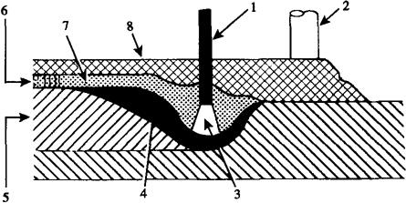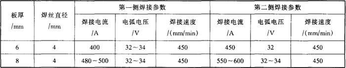 图6-6 埋弧焊示意图 1-丝极;2-喂焊剂嘴;3-电弧;4-液态焊缝金属;5-固态焊缝金属;6-渣;7-熔化焊剂;8-焊剂 埋弧焊的引弧、送丝、移丝和灭弧等动作,通常是由机械完成,故称为埋弧自动焊。埋弧焊具有如下优点:①机械化程度高,对焊工技艺水平要求低;②焊接电流大,可减少焊件的坡口,焊接效率高;③焊剂能隔开熔化金属与空气的接触,保护效果好、焊缝质量高;④没有弧光辐射,劳动条件较好。缺点是只能在平焊位置焊接,对焊接设备和工装器具要求较高。 埋弧焊的焊接设备一般有两种。一种是等速送丝埋弧焊机,送丝速度按设定的速度不变,维持电弧相对稳定是依靠电弧的自身调节作用。另一种是变速送丝埋弧焊机,它是利用电弧电压作为反馈信号,经过控制系统改变送丝速度,从而保持电弧的相对稳定。另外,为了确保焊接过程处于最适合的位置和焊接过程的稳定可靠,埋弧焊还需要较为复杂的辅助设备与焊机相配合,常用的辅助设备有:焊件的变位设备、焊接操作机(即焊机机头变位设备)、焊接夹具和焊缝成形设备等。 埋弧焊由于电流大、熔深大,其坡口形式和尺寸要求是:厚度小于12mm板不用开坡口,厚度在12~20mm之间的可以采用单面焊,反面清根进行焊接,大于20mm时要求开坡口,但其钝边要求有5~6mm。焊接电流是根据焊丝的直径、焊件的厚度、以及焊剂型号来选择。由于埋弧焊焊接电流大,第一层焊时容易发生烧穿,常采用以下几种施焊工艺:焊条电弧焊封底焊、永久垫板埋弧焊、锁底对接接头埋弧焊、焊剂垫埋弧焊。表6-4为典型的不开坡口双面对接埋弧焊焊接参数。 表6-4 双面对接埋弧焊接奥氏体型不锈钢的焊接参数
