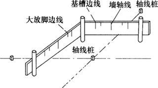 图1-33 龙门板与控制桩 (4)用钢尺沿龙门板顶面检查轴线钉之间的距离,其相对误差不应超过1/2000,经检查合格后,将墙和基槽宽度标在龙门板上,最后根据基槽上口宽度拉线,并用石灰粉撒出基槽的开挖线。 (二)基坑(槽)的放线 依据龙门板确定的基础的底面尺寸,并依据埋置深度、土质好坏、地下水位等情况,考虑在施工过程中是否留工作面、放坡、设置排水设施和支撑等,从而定出挖土的边线,进行基坑(槽)的放线。在基坑(槽)的实际施工中,挖土边线的确定有以下几种情况: 1.不放坡不设支撑 当土质比较均匀且无地下水时,在表1-17中规定范围内的各类土和挖土深度,其挖土边坡可做成直立壁不加支撑,基础底面的尺寸就是放灰线的尺寸。但是,在实际开挖中很难掌握直立壁绝对垂直,一般情况下,在挖土深度大于2.0m时,掌握放灰线尺寸稍大于基础底面尺寸。 表1-17 直立壁不加支撑的土方开挖深度表