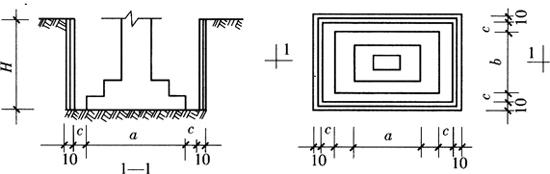 图1-34 直立壁加支撑 3.放坡不加支撑 当基槽的开挖深度超过表1-17中的规定,且深度在5.0m以内,土质均匀,无地下水时,可考虑放坡不加支撑。具体放坡的宽度,应根据施工经验而确定,也可参照表1-18中的最陡坡度进行计算。基槽挖土的放线尺寸,除考虑需要增加混凝土基础所需工作面外,还应增加因放坡所需上口放坡宽度。 表1-18 深度在5m内的基坑(槽)、管沟边坡的最陡坡度(不加支撑)