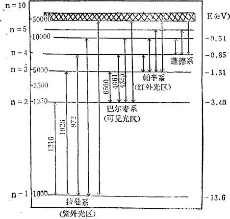 图2-11 氢原子的能级图 (1)电子有基态、激发态和离子三个能级,激发态又有n=1至n=∞的许多能级; (2)处于基态的电子,在轨道上运动,没有辐射产生; (3)当电子获得能量跃迁时,才产生辐射。辐射为一系列不连续值,所以原子光谱为线光谱,并且是负值。即电子须获得一定能量才可跃迁。见图2-12。