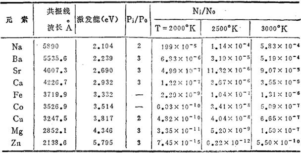公式中:Nj,N0——分别为激发态、基态原子数目; gj,g0——分别为激发态、基态的统计权重(统计权重是指粒子在某一能级下可能具有的几种不同状态数); e——自然对数; Ej——激发能量; K——波茨曼常数=1.38×-18尔格/度; T——绝对温度。 在原子光谱学中,Pj/P0及Ej都是已知,所以只要确定火焰温度T后,就可以求出Nj/N0值。 在常用温度2000-3000°K范围,大多数化合物可成原子态,其中可能有部分为激发态,也即火焰中的原子有基态,也有激发态。由表2-5可见,最低激发态的原子数与基态原子数的比值是比较小的。如3000°K时,Ba的比值只有10-4左右,因之Nj比N0小到可以略而不计。火焰中基本上是呈基态原子状态存在的。火焰温度稍发生改变,Nj就发生较大的变化,但对N0的影响都很小,因此,原子吸收分光光度法可获得较好的稳定性。 表2-5 温度对各种元素共振线的Nj/N0比值的影响