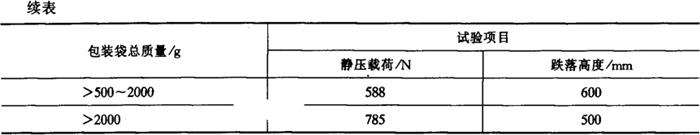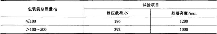 2.5 包装袋经静压(保压1min)和跌落试验,封口应完好无损,试验项目如表2-5-3所示。