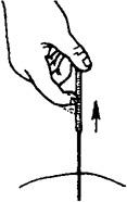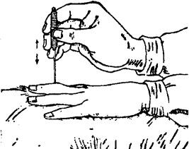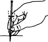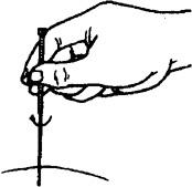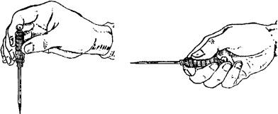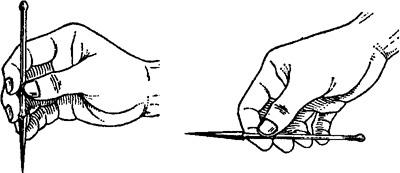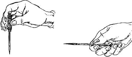 图1.3.1-2 毫针的持针法 2.圆利针的持针法 与地面垂直进针时,以拇、食指夹持针柄,以中指、无名指抵住针身(图1.3.3)。与地面水平进针时,则用全握式持针法,即以拇、食、中指捏住针体,针柄抵在掌心(图1.3.4)。进针时,可先将针尖刺至皮下,然后根据所需的进针方向,调好针刺角度,用拇、食、中指持针柄捻转进针达所需深度。
