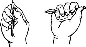 图1.3.7-8 三棱针持针法 5.火针的持针法 烧针时,针尖先向下,然后向上倾斜,始终保持针尖在火焰中。扎针时,因穴而异。与地面垂直进针时,似执笔式,以拇、食、中三指捏住针柄,针尖向下(图1.3.9);与地面水平进针时,似全握式,以拇、食、中三指捏住针柄,针尖向前(图1.3.10)。