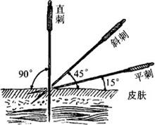 图1.3.16 管针进针法 5.针头套针法 对皮肤硬而厚的家畜施毫针术时采用。即先用一较毫针粗的注射针头速刺入穴位,再将毫针顺针孔刺入。 (四)针刺角度和深度 1.针刺角度 针刺角度是指针体与穴位局部皮肤平面所构成的夹角,它是由针刺方向决定的,常见的有三种(图1.3.17)。