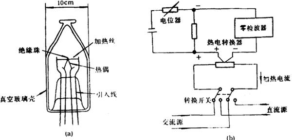 图7.5-1 (a)单热电转换器示意图和(b)热电转换器用作交直流转换的基本电路