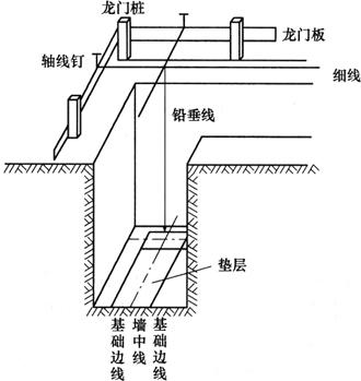 图10-16 测设水平桩(单位:m) 2.基础施工测量 (1)垫层中线的测设 基础垫层浇注后,根据龙门板上的轴线钉或轴线控制桩,用经纬仪或用拉绳挂垂球的方法(图10-17),把轴线投测到垫层面上,并用墨线弹出墙中心线和基础边线,作为砌筑基础的依据。由于整个墙身砌筑均以此线为准,所以要进行严格校核。