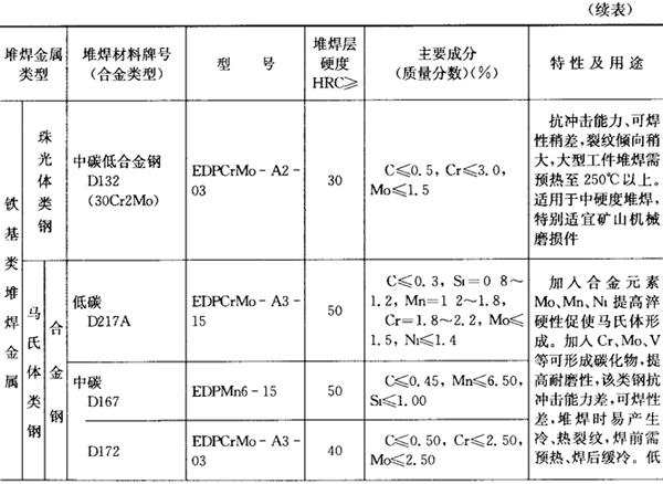 | 释义 | 堆焊材料 1.堆焊金属的类型 (1)按堆焊材料的形状分类:堆焊材料因合金成分及其含量的不同,按可加工性分别制成带、铸条、粉(颗)粒、焊条或药芯焊丝。 (2)按堆焊金属的化学成分和组织结构分类:铁基类堆焊金属(包括珠光体类堆焊金属、马氏体类堆焊金属、奥氏体类堆焊金属及合金铸铁类堆焊金属);镍基合金堆焊金属;钴基合金堆焊金属;铜基合金堆焊金属及碳化钨堆焊金属。 2.堆焊材料的主要成分、特性及用途 表3.5-1为常用堆焊材料的主要成分、特性及用途举例,供选用时参考。 表3.5-1 堆焊材料的主要成分、特性及用途