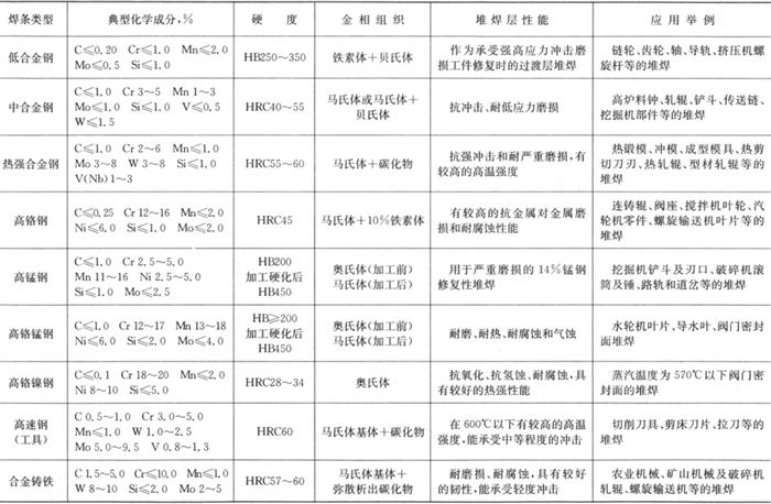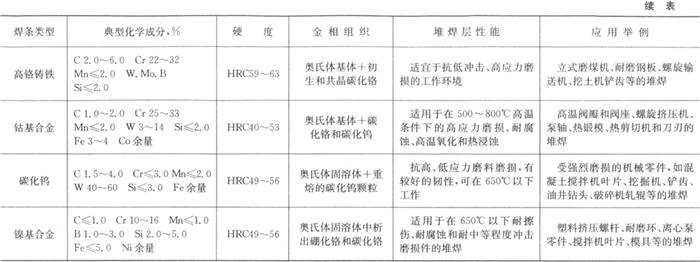 | 释义 | 堆焊焊条熔敷金属化学成分和性能 表4.2-13列出耐磨堆焊焊条熔敷金属典型化学成分、硬度、组织和堆焊层性能的一览表,表中的化学成分仅为典型例子,建立此表的目的在于供读者了解耐磨堆焊焊条各种性能关系以及作为在初步选用堆焊焊条时的一种参考资料。 表4.2-13 堆焊焊条熔敷金属化学成分、硬度、组织和性能一览表