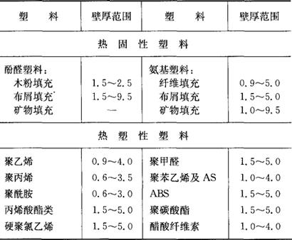 | 释义 | 塑料制品的结构工艺性 塑料制品的结构工艺性直接影响制品本身的性能指标、成型工艺的实施和模具结构的复杂程度。因此,模具设计人员必须熟悉与设计模具有关的塑料制品结构工艺性方面的要求,以便在满足使用要求的前提下,考虑塑件在模具中成型的特点,充分发挥所用塑料在性能上的优势,达到简化塑件及模具结构、降低生产成本的目的。 塑料制品结构设计的主要内容如下: 1.壁厚(表2.2-24)及注射压力一定时的L/t(表2.2-25) 表2.2-24 常用塑料制品壁厚范围 (mm)
