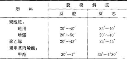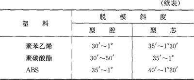 塑件壁厚的选择原则: ①从塑件结构考虑:塑件应有足够的强度和刚度;塑件壁厚应尽量均匀,不同壁厚或转角处比例不应相差太大(不超过1∶3),并且应尽量用圆弧过渡;嵌件部分的包容塑料不宜太小,以防开裂。 ②从塑件成型考虑:壁厚应与塑料流动性和成型压力适应(表2.2-30);壁厚应适应塑件形状的需求。 ③从脱模考虑:应能承受脱模力的作用。 2.脱模斜度(表2.2-26) 表2.2-26 塑件脱模斜度