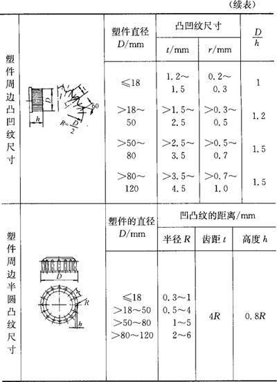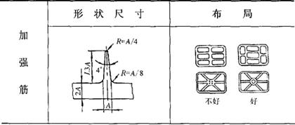 塑件脱模斜度的选择原则: ①在许可的情况下,斜度尽量取大。 ②塑件内表面斜度>外表面斜度。 ③形状复杂的塑件比形状简单的塑件的斜度大。 ④厚壁塑件比薄壁的斜度大。 ⑤热塑性塑料比热固性塑料的斜度大。 ⑥硬塑料比软塑料的斜度大。 3.加强与防止变形的结构(表2.2-27) 表2.2-27 加强与防止变形的结构