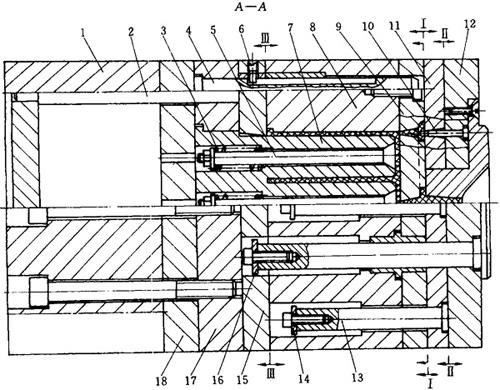 1—支座 2—推杆 3—弹簧 4—导柱 5—阀杆 6—螺钉 7—型芯 8—定模板 9—浇口板 10—拉料杆 11—托板 12—定模座板 13—定距拉杆 14—垫圈 15—推件板 16—垫圈 17—型芯固定板 18—支承板