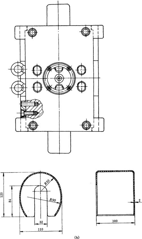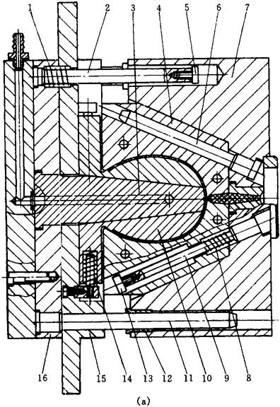 图5-6(b) 塑料罩注塑模具俯视图及塑件图 1—弹簧 2—定距拉杆 3—型芯 4—斜滑块 5—螺钉 6—斜导柱 7—定模板 8—弹簧 9—定距拉杆 10—内滑块 11—导柱 12—导套 13—螺钉 14—弹簧 15—推件板 16—型芯固定板 |