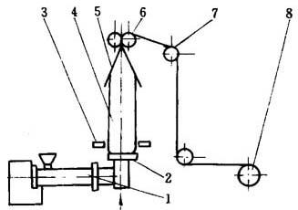图7-3 平挤下吹工艺流程简图 1-挤出机 2-机头 3-冷却装置 4-膜管 5-人字板 6-牵引辊 7-导向辊 8-收卷装置 但是,整个管泡挂在尚未定型的塑性段上,在生产较厚的薄膜或牵引速度较快时易拉断管泡,对于密度较大的塑料,用此法生产则更困难;挤出成型机必须安装在较高的操作台上,安装费用增加,操作也不方便。因有水套对管泡进行急剧冷却,此法适用于熔体粘度小、结晶度较高的树脂(如PP树脂)等,生产高透明度的包装薄膜。 |