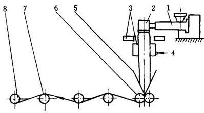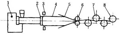 图7-1 平挤上吹工艺流程简图 1-挤出机 2-机头 3-风环 4-膜管 5-人字板 6-牵引辊 7-导向辊 8-收卷装置 平挤上吹使用直角机头,机头的出料方向与挤出成型机料筒中物料流动方向垂直;挤出的管坯垂直向上引出,经吹胀压紧后导入牵引辊。用这种方法生产的主要优点是:整个管泡都挂在管泡上部已冷却的坚韧段上,所以,薄膜牵引稳定,能制得厚度范围较大和幅宽范围较大(如直径为10m以上)的薄膜,而且,挤出机安装在地面上,不需要操作台,操作方便,占地面积小;厚度范围宽,厚薄相对均匀。平挤上吹方法的主要缺点是管泡周围的热空气向上,而冷空气向下,对管泡的冷却不利;物料在机头拐90°的弯,增加了料流阻力,塑料有可能在拐角处发生分解;厂房的高度要高。此外,机头和辅机的结构也复杂。 平挤平吹法的工艺流程见图7-2,使用直通式水平机头,机头和辅机的结构都比较简单,设备的安装和操作都很方便;但挤出机的占地面积大。由于热气流向上,冷气流向下,管泡上半部的冷却要比下半部困难。当塑料的密度较大或管泡的直径较大时,管泡易下垂,薄膜厚度均匀性差,不易调节。通常,幅度在600(1)mm以下的PE等吹塑薄膜才可以用此法成型。
