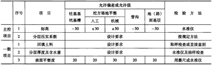 | 释义 | 填土的质量控制与检验 1.填土在施工过程中,应检查排水措施、每层的填筑厚度、土料的含水量和压实程序。 2.对有密实度要求的填方,在夯实或压实之后,要对每层回填土的质量进行检验,一般可采用环刀法(或灌砂法)取坪测定土的干密度,求出土的密实度,或用轻便的触探仪直接通过锤击来检验土的干密度和密实度,待符合设计要求后,才能填筑上层土料。 3.填土压实后的干密度,应有90%以上符合设计要求,其余10%的最低值与设计值之差,不得大于0.08g/cm3,并且不得集中。 4.填方施工结束后应检查标高、边坡坡度和压实程度等,检验标准见表1-28。 表1-28 填土工程质量检验标准