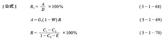 R1——填料留着率(%) A——纸张中填料含有量(kg) D——加入纸料中填料量(kg) G1——成品实量(kg) W——成纸水分(%) R——纸张填料含量(%) C1——绝干纸的灰分(%) C2——绝干纸中纤维的灰分(%) E——绝干填料的灼烧损失率(%) |