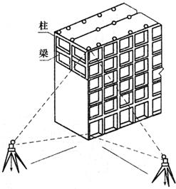 图10-20 框架结构吊装测量 框架结构建筑物的构件吊装中,柱的观测和校正是重要的环节,它直接关系到整个结构的质量。此外还应注意以下几点: 1)随着工序的进展,荷载的变化对每根柱均需重复多次校正和观测垂直偏移值。 2)多节柱分节吊装时,要确保下节柱的位置正确,否则可能会导致上层形成无法矫正的累积偏差。 在施工测量中,由于高层建筑的体形大、层数多、高度高、造型多样化、建筑结构复杂、设备和装修标准高,因此,在施工过程中对建筑物各部位的水平位置、轴线尺寸、垂直度和标高的要求都十分严格,对施工测量的精度要求也高。为确保施工测量符合精度要求,应事先认真研究和制订测量方案,拟定出各种误差控制和检核措施,所用的测量仪器应符合精度要求,并按规定认真检校。 |