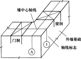 | 释义 | 墙体施工测量 1.墙体定位 在基础层施工完成后,要进行±0以上的施工抄平放线工作,方法与基础施工时类似。利用轴线控制桩或龙门板上的轴线和墙边线标志,用经纬仪定线法或顺小线悬挂垂球的方法将轴线投测到基础面防潮层上,投点容许误差为±5mm。然后用墨线弹出墙中线和墙边线。检查外墙轴线交角是否等于90°,符合要求后,把墙轴线延伸并画在基础墙的立面上,同时用红三角形将其标定,如图14-16所示,作为向上投测轴线的依据。此外,也把门、窗和其他洞口的边线在外墙基础立面上画出。