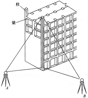 图14-18 经纬仪正倒镜取中法 当把轴线投测到楼板上后,应用钢尺实测其间距离,丈量值与设计值之相对精度不应低于1/2000~1/5000,合格后方可在楼板上进行弹线。 为了保证投点精度,投测前应仔细地检校经纬仪,尤其应使照准部水准管垂直于竖轴;投测时应仔细地安置仪器,严格整平。同时,应设法减少竖直角,仪器与建筑物之间的距离应大于建筑物的高度。当用全站仪进行投测时,可使用电子气泡来进行整平,对于要求垂直精度特别高(如≤1/10000)的工程,可使用水准仪来进行轴线投测。 (2)标高传递 标高传递是指将建筑物的相对高程系统传递到不同的工作面上。常用的楼层标高传递有两种: 1)皮数杆法。即每层砌好后,以首层皮数杆起,逐层向上衔接。 2)钢尺直接测设法。即通过悬吊钢尺,沿墙角自±0标高线起用检定过的钢尺直接向上测设,把高程传递上去。 |