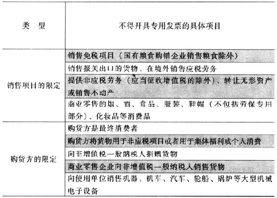 | 释义 | 增值税专用发票的开具范围 《增值税专用发票使用规定》规定,一般纳税人销售货物(包括视同销售货物在内)、应税劳务、根据增值税细则规定应当征收增值税的非应税劳务(以下简称销售应税项目),必须向购买方开具增值税专用发票。但下列情形不得开具增值税专用发票: (1)向消费者销售应税项目。 (2)销售免税项目,国有粮食购销企业销售粮食除外。 (3)销售报关出口的货物、在境外销售应税劳务。 (4)将货物用于非应税项目。 (5)将货物用于集体福利或个人消费。 (6)提供非应税劳务(应当征收增值税的除外)、转让无形资产或销售不动产。 向小规模纳税人销售应税项目,可以不开具增值税专用发票。 一般纳税人将货物无偿赠送给他人,如果受赠者为一般纳税人,可以根据受赠者的要求开具增值税专用发票。 商业零售企业只能对购货方为一般纳税人的单位开具增值税专用发票,索取专用发票的购货方必须持盖有一般纳税人戳记的税务登记证(副本),未提供证件的,商业零售企业一律不得开具专用发票。 综上所述,增值税专用发票的开具范围受两个方面因素限制(见表6-3): 表6-3 不得开具专用发票项目一览表