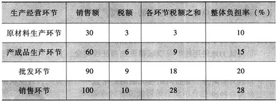 | 释义 | 增值税的产生 增值税是现代商品经济条件下社会化大生产的产物,是适合社会生产力和经济发展以及国家财政需要而产生的。它的产生和发展是税收制度发展的必然趋势。早在第一次世界大战结束时,美国耶鲁大学教授托马斯·S·亚当斯和当时任德国政府顾问的学者威尔海姆·F·西门子博士首次提出增值税的设想,当时他们称自己的设想是一个“精巧的销售税”。增值税的产生是因为传统的、按商品全部流转额征税的阶梯式流转税制所存在的重复征税问题,已成为商品经济发展的桎梏,严重束缚了生产力的发展。 流转税的特征是对商品流转的每一个环节都要征税,这就是所谓的“道道征税”。增值税以前的流转税在每一环节征税时,均以全部流转额为计税依据,这样就使一件商品的整体税负随商品流转环节的增加呈阶梯式递增。 阶梯式流转税整体负担率表见表1-1: 表1-1 阶梯式流转税整体负担率表 税率10%