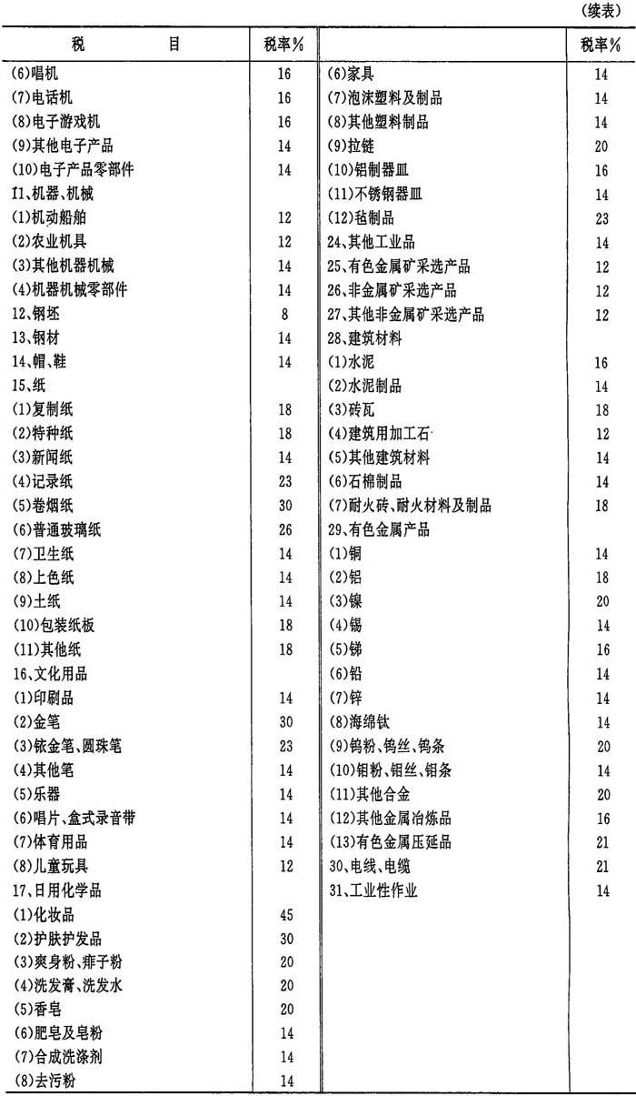 增值税税目是按应税产品的不同类别通过列举应税产品分别设置的法定征税项目,未列举的不征增值税.增值税的税目随增值税征收范围的扩大而发展,现行增值税的税目依照对应税产品的分类繁简程度分为税目和子目两个层次,有31个税目125个子目.增值税的税率是按应税增值税额计算应纳增值税额的法定比率.现行增值税采用比例税率按增值税的税目或子目分别设置,其特点是:档次多,共有12个档次;差别幅度大,从8%到45%高低相差5倍多;多数税目采用14%的税率,在设有税率的144个税目和子目中,有66个税率为14%。