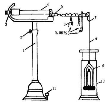 图10-2-3 韦氏天平 1-支架 2-调节器 3-指针 4-横梁 5-刀口 6-游码 7-小钩 8-细白金丝 9-浮锤 10-玻璃筒 11-调整螺丝 测定要点:将天平安装好,将浮锤挂在钩上,旋转调整螺丝使两个指针对准。 向玻璃筒中注入经煮沸30min的蒸馏水,将浮锤浸入水中,玻璃筒置于20℃恒温水浴中,小钩上挂上游码,使天平保持平衡。 将玻璃筒中水倾出,玻璃筒及浮锤用乙醇或乙醚洗涤数次,吹干,注入试样(20℃),同样置于水浴中,调节游码使梁上游码都放在刻度上。如果在同一刻度上需要放两个游码,则将小的挂在大的游码上(如图)。如果试样相对密度大于1,则单位游码挂在小钩上,待天平保持平衡,记录读数( 2.比重瓶法 比重瓶见示图10-2-4。比重瓶主体容积一般为15~25ml;侧管尖端呈毛细管状;温度计分度值为0.2℃。
