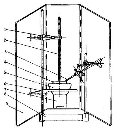 图10-2-2 比色箱 1.3-磨砂玻璃 2-日光灯 (二)酯含量测定 增塑剂与氢氧化钾乙醇溶液经煮沸回流发生水解作用,剩余之碱液用标准盐酸溶液进行滴定以测定其酯含量。 测定要点:称取试样0.5~1.0g(准确到0.0002g)置于锥形瓶中,用移液管准确加入50ml0.5N氢氧化钾乙醇溶液,然后装上回流冷凝管,并附加吸收CO2的苏打石灰管,于沸水浴中回流1.5h,用10ml左右新煮沸蒸馏水冲洗冷凝管管壁,冷却后加入2~4滴1%酚酞指示剂,以0.5N盐酸溶液滴定至粉红色消失,即为终点。用同样条件作一空白试验,酯含量计算公式见GB1665-81。 (三) 相对密度测定测定相对密度有韦氏天平法和比重瓶法。 1. 韦氏天平法韦氏天平见示图10-2-3。