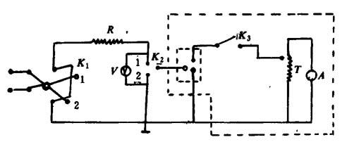 图10-2-5 闪点测定仪 1-温度计夹头 2-温度计 3-引火器 1-内坩埚 5-外坩埚 6-坩埚托 7-电炉 8-底座 9-挡风屏 试验方法:将试样注入坩埚中。闪点在210℃以下的试样,液面装到距坩埚边缘12mm处,闪点高于210℃的试样,装到距坩埚边缘18mm处,液面以上的坩埚壁不应沾有试样。温度计垂直固定在试样中,水银球应位于内坩埚中央。升温速度开始为每分钟10℃,当试样温度达到预期闪点前40℃时,控制为每分钟4±1℃。当试样温度达到预期闪点前10℃时,点火器火焰放到距液面表面10~14mm处,并沿水平面作直线运动。点火器从坩埚的一边移至另一边需时间2~3s,试样温度每升高2℃重复一次点火试验。点火器的火焰高度约3~4mm。液面上方最初出现蓝色火焰时的温度即为闪点。 (八)体积电阻率测定 仪器:平板状黄铜电极和圆柱状黄铜电极的规格和图参照GB1672-81。 测定方法:线路图见图10-2-6。